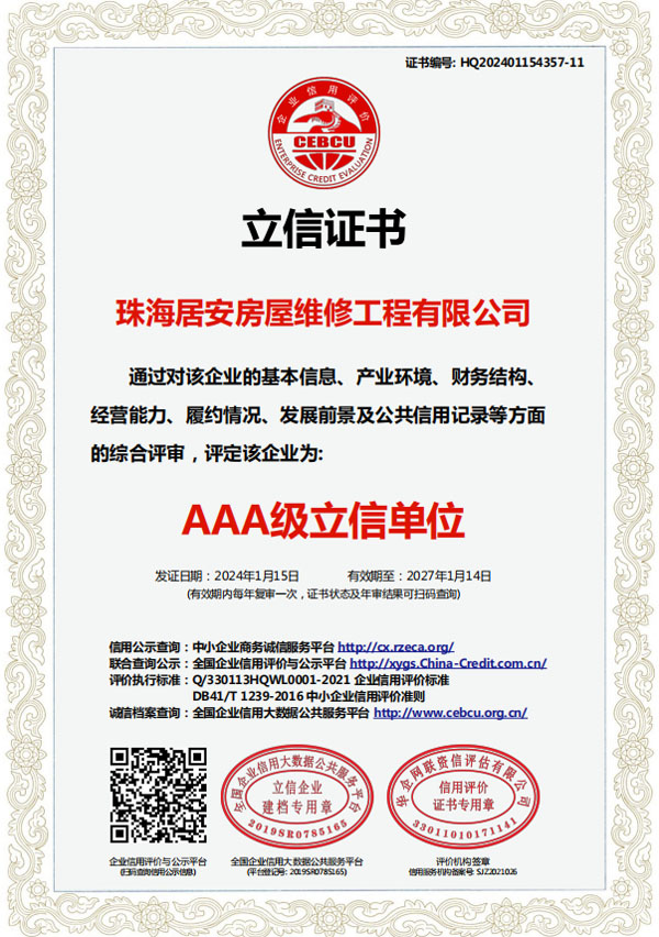 珠海居安房屋維修工程有限公司成立于2020年,是一家專注房屋維修的公司。我們擁有各類型專業(yè)人才,業(yè)務(wù)包括老舊建筑翻新改造、外墻空鼓修復(fù)、防水幕墻養(yǎng)護(hù)、外墻預(yù)置構(gòu)件拆除更換、供排水管網(wǎng)改造、墻面翻新、鋼制結(jié)構(gòu)建筑構(gòu)建及折除,外墻清洗及裝修裝飾。 公司自成立以來,始終堅(jiān)持以人為本、誠信敬業(yè)的經(jīng)營原則,與多家單位達(dá)成固定維修、養(yǎng)護(hù)清洗協(xié)儀,業(yè)務(wù)遍及廣州、東莞、中山、珠海等多個周邊城市。專業(yè)化團(tuán)隊(duì)尤其在墻面及窗邊防水工程業(yè)內(nèi)知名。…… >>> 更多內(nèi)容 |